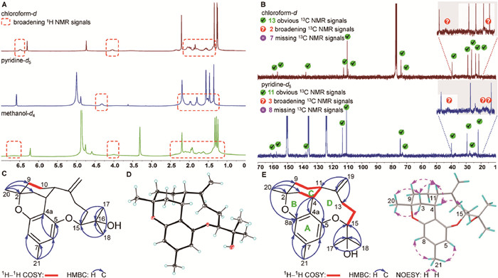 Figure 2  1H (400 MHz, A) and 13C (100 MHz, B) NMR spectra of 1 at 298 K with broad signals. Key 1H–1H COSY and HMBC correlations of 1 (C). ORTEP drawing of the crystal structure of 1 with the ellipsoid contour at 15% probability level (D). 1H–1H COSY, HMBC, and NOESY correlations of 2 (E).