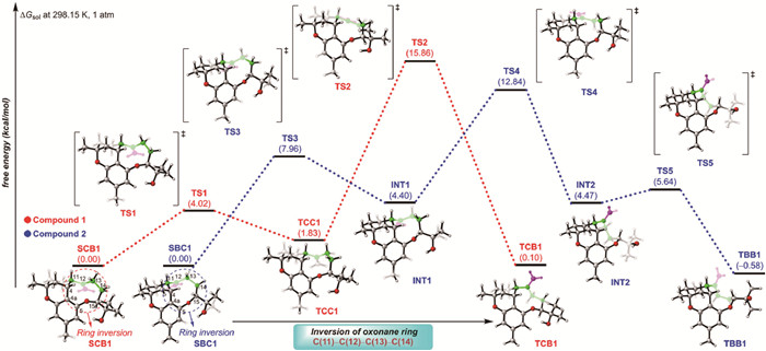 To investigate the conformational exchange of the oxonane ring, the relaxed potential energy surface scan along the torsion angle ωC11–C12–C13–C14 was conducted at B3LYP/6-31G(d, p) level using Gaussian 09 program [13,20], starting from conformer SCB1. Results (Fig. S10 in Supporting information) revealed the inversion involves two steps: SCB1 migrates to TCC1 through TS1, and then, TCC1 transitions to TCB1 through TS2. Subsequent optimization and Gibbs free energies calculations at the M06-2X/def2-TZVP level in chloroform (Fig. 3 and Table S9 in Supporting information) revealed a lower energy barrier $\left(\Delta G^{\ddagger}\right)$ of 15.86 kcal/mol from SCB1 to TCB1 [21]. Thus, SCB1 and TCB1 readily interconvert in chloroform at 298 K.