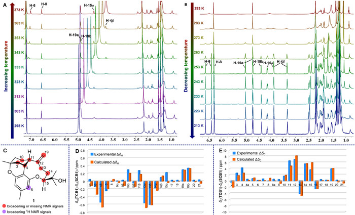 Figure 4  Temperature-dependent 1H NMR (600 MHz) spectra of 1 in pyridine-d5 (298–373 K, A) and in chloroform-d (213–293 K, B), respectively. Broadening or missing NMR signals in 1 in 298 K (C). The experimental (213 K) and calculated 1H (D) and 13C (E) NMR chemical shifts differences between conformers SCB1 and TCB1.