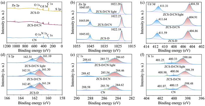 Figure 2  (a) The XPS spectra of pristine CN, ZCS-D/CN, and ZCS-D. The survey spectra: (b) Zn 2p, (c) Cd 3d, (d) S 3d, (e) C 1s, (f) N 1s.