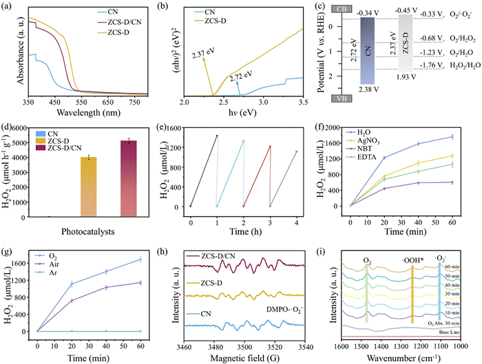Figure 3  (a) UV–vis DRS and (b) corresponding plots of the converted Kubelka–Munk function versus photon energy for the prepared samples. (c) The band structure of CN and ZCS-D. (d) The photocatalytic PHP performance graph. (e) The 4 h cycle graph with four cycles. (f) Comparison of H2O2 production by ZCS-D/CN under the different conditions over 1 h: H2O, EDTA (0.5 mmol/L), NBT (0.06 mmol/L), and AgNO3 (0.5 mmol/L). (g) Controlled experiments: air atmosphere, Ar atmosphere and O2 atmosphere. (h) O2 was detected by EPR trapping experiments under light irradiation. (i) In situ FTIR spectra of ZCS-D/CN in photocatalytic reaction.