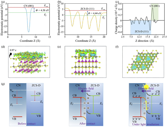 Figure 4  (a) Electrostatic potentials of CN (001) and (b) ZCS-D (111) surface. (c) Bader charge analysis of CN absorbed with ZCS-D. (d-f) The charge accumulation is shown as the yellow region, and the charge depletion is shown as the cyan region. (g) Charge transfer diagram of S-scheme heterojunction.
