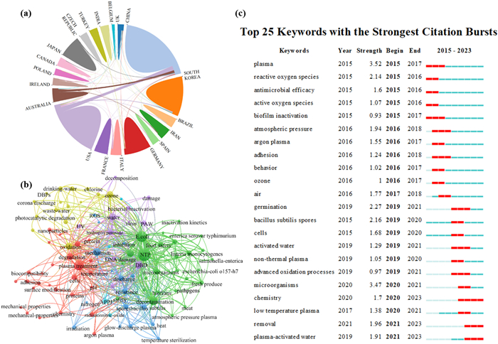 Figure 2.  (a) National publication volume and cooperation relationship. (b) Average year publication volume and keyword frequency of plasma disinfection. (c) Keywords with the strongest citation burs. The data in this figure is sourced from Web of Science, with the keywords “plasma or PAW” and “disinfection, and the retrieval date is from 2015 to 2021.