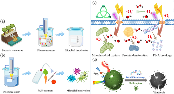 Figure 4  (a) Treatment of microorganisms in water by NTP. (b) PAW disinfection. The inactivation mechanism of (c) fungi and (d) virus.