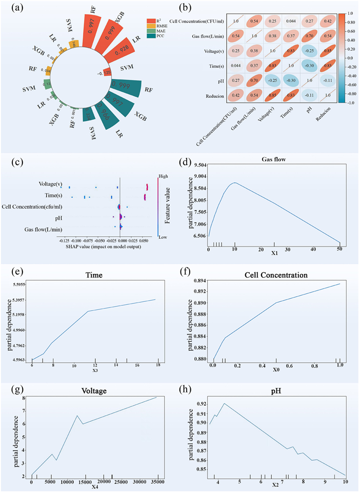 Figure 5  (a) The radial cylinder chart compares the performance of machine learning models. (b) The correlation heatmap demonstrates the correlation between influencing factors and the degradation rate. (c) The five most important factors associated with the plasma degradation efficiency of E. coli determined by Tree SHAP. The PDP analysis chart shows the impact of individual factors on the degradation rate: (d) Gas flow, (e) time, (f) cell concentration, (g) voltage, (h) pH.