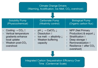While the solubility pump, biological pump, and carbonate pump are well-established components of the marine carbon cycle, recent advances suggest the need to revisit their interactions under climate change. The solubility and carbonate pumps are chemically integrated through temperature-dependent CO2 solubility, carbonate equilibria, and buffering capacity. Ford et al. [1] demonstrate that micro-scale vertical temperature gradients near the sea surface significantly enhance CO2 uptake by increasing solubility locally, refining classical solubility pump estimates and revealing an underappreciated interface with carbonate chemistry. Meanwhile, Koeve et al. [2] show that during temperature overshoot and net-negative CO2 emission phases, the biological pump becomes the dominant mechanism for long-term carbon retention, as enhanced ocean stratification slows deep water ventilation, promoting organic matter remineralization and deep-sea carbon storage. This highlights a temporal decoupling. As the solubility and carbonate pumps weaken or reverse, the biological pump continues to sequester carbon on centennial timescales. Additionally, Hill et al. [3] demonstrate that ice sheet meltwater alters carbonate saturation and supplies bioavailable iron, indirectly stimulating phytoplankton blooms and enhancing the biological pump. These findings underscore the importance of viewing the ocean carbon system not as three isolated pumps but as a chemically and physically integrated network that evolves dynamically under climate stressors. We plot the following diagram to illustrate these relationships (Fig. 1).