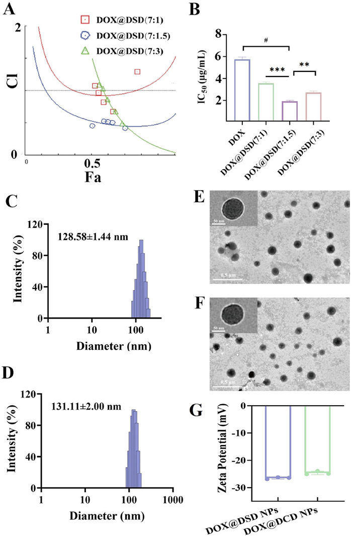 Figure 1.  Characterization of DOX@DSD NPs and DOX@DCD NPs. (A) Fa-CI plot of DOX and DSD at different combined ratios. (B) half maximal inhibitory concentration (IC50) of DOX and DSD with different combined ratio. The size by intensity (C), transmission electron microscope (TEM) images (E) and zeta potential (G) of DOX@DSD NPs. The size by intensity (D), TEM images (F) and zeta potential (G) of DOX@DCD NPs. Scale bar: 500 nm, insert bar: 50 nm. Data are presented as mean ± standard deviation (SD) (n = 3). **P < 0.01, ***P < 0.001, #P < 0.0001.