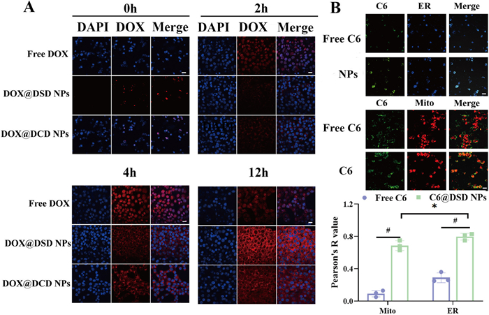 Figure 2  Cellular uptake and ER targeting. CLSM (A) measurements of DOX@DSD NPs or DOX@DCD NPs incubated with 4T1 cells for 12 h. DAPI: 4′,6-diamidino-2′-phenylindole. Scale bar: 50 µm. (B) Colocalization fluorescence images of C6@DSD NPs with different organelle-trackers. Scale bar: 50 µm. Data are presented as mean ± SD (n = 3). #P < 0.0001.