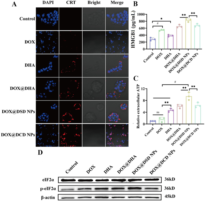 ER stress was reported to be involved in ICD induction [38,39]. Therefore, we further investigated the activation of the ER stress-related proteins like eukaryotic initiation factor 2 alpha (eIF2α). The Western blot (WB) analysis released that DHA@DOX, increased the expression of phospho-eIF2α (p-eIF2α), indicating stronger ER stress. Additionally, among the five drug treatment groups, DOX@DSD NPs were the most effective in promoting the phosphorylation of eIF2α (Fig. 3D and Fig. S15 in Supporting information), with a p-eIF2α/eIF2α expression ratio of approximately 0.9. This led to more pronounced ER stress, increased CRT exposure, and elevated secretion of ATP and HMGB-1. These results suggested that DHA enhanced the DOX's ability to induce ICD effect, especially with DOX@DSD NPs, likely due to the efficient internalization of DOX@DSD NPs into tumor cells and rapid release free DHA.