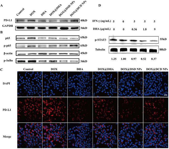 Next, we explored the mechanism by which DHA suppressed PD-L1 expression on cancer cell surfaces. On the one hand, various chemotherapy drugs such as gemcitabine, paclitaxel, carboplatin, and irinotecan have been reported to upregulate PD-L1 expression via NF-κB pathway in various types of tumors [3941]. To assess the impact of DOX on the activation of the NF-κB pathway, 4T1 cells were treated with different formulations for 24 h and analyzed by WB. Treatment with free DOX induced activation of NF-κB, characterized by the increased expression p-p65 and p-NF-κB inhibitor alpha (p-IκBα) (Fig. 4B). In contrast, treatment with DOX/DSD NPs inhibited NF-κB pathway activation, leading to a decrease in the expression of p-p65 and p-IκBα (Fig. S18 in Supporting information), suggesting that DHA played a role in attenuating PD-L1 levels through the NF-κB pathway.