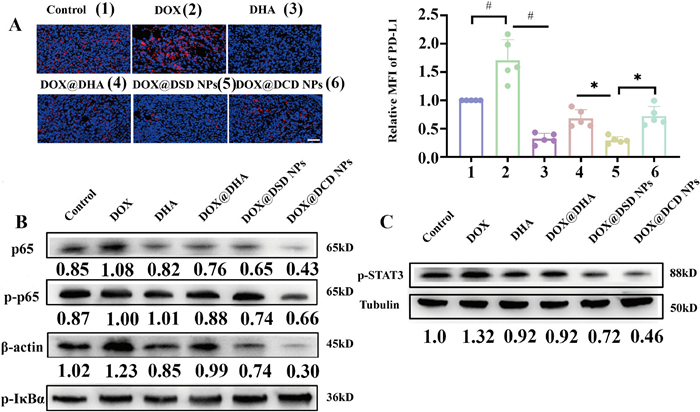 Figure 6.  Reversion of immunosuppression from PD-L1 in vivo. (A) Representative immunofluorescence images of PD-L1 exposure in tumor mass (n = 5). Scale bar: 50 µm. (B) Representative WB images of protein expressions related NF-κB pathway in tumor mass (n = 3). (C) Representative WB images of p-STAT3 tumor mass (n = 3). Data are presented as mean ± SD. P < 0.05, #P < 0.0001.