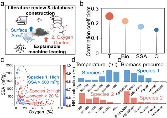 Figure 1.  (a) Two strategies for targeted modification of NRBCs derived from ML: enhancing specific surface area (SSA) and oxygen content. (b) Bar chart of Spearman correlation coefficient for the four features most correlated with NR contribution efficiency. (c) Scatter plot of SSA and oxygen content for samples with NR contribution efficiency exceeding 50%. The blue circle indicates that SSA of samples with a high NR contribution efficiency is greater than 500 m2/g (Species 1), while the red circle indicates that oxygen content is greater than 20% (Species 2). (d) Temperature distribution histograms of Species 1 and Species 2. (e) Biomass precursor distribution histograms of Species 1 and Species 2.