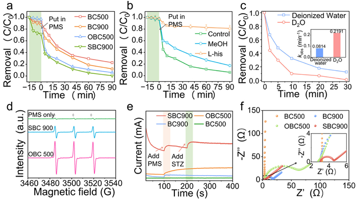 Figure 2  (a) The performance of BC samples. (b) Effects of different scavengers on the performances in OBC500 system for STZ removal ([STZ]0 = 20 mg/L, [catalyst]0 = 20 mg/L, [PMS]0 = 0.80 g/L, initial pH 6.3, [MeOH]0 = 2.6 mol/L, [L-His]0 = 26 mmol/L). (c) Effect of D2O on STZ removal efficiency ([STZ]0 = 20 mg/L, [catalyst]0 = 0.10 g/L, [PMS]0 = 1.6 g/L). (d) ESR spectrum for the detection of TEMP-1O2 in NRBC/PMS system. (e) The it curves illustrate the current response when the PMS and STZ are added in NRBC/PMS system. (f) Nyquist plots of electrochemical impedance spectroscopy (EIS) spectra.