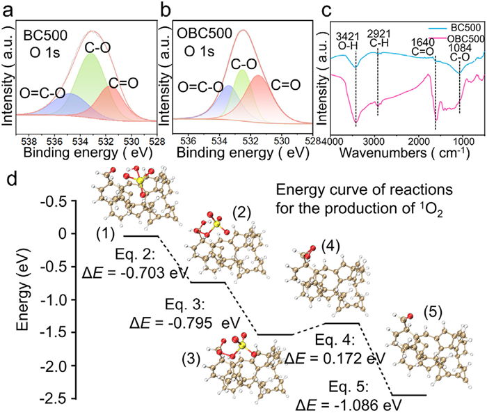 Figure 3.  The O 1s spectrum of (a) BC500 and (b) OBC500. (c) The FTIR spectrum of BC500 and OBC500. (d) Specific steps of PMS decomposition, accompanied by the corresponding energy curves. The color representation indicates the presence of hydrogen, carbon, oxygen and sulfur atoms, respectively, as white, tan, red and yellow.
