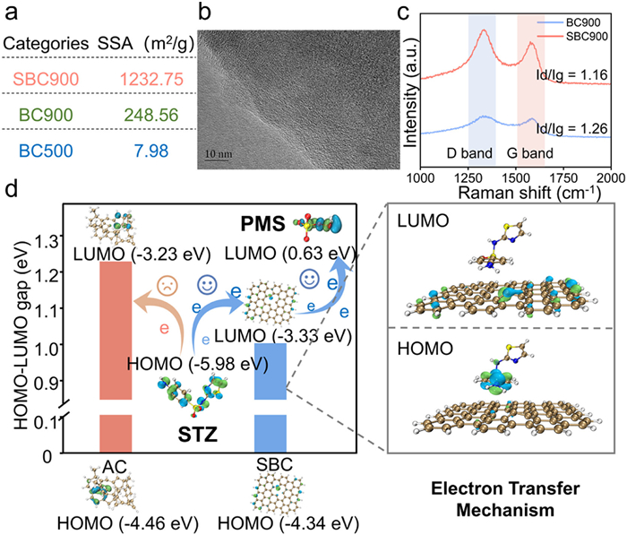Figure 4.  (a) The SSA of BC500, BC900 and SBC900. (b) Transmission electron microscopy (TEM) image of SBC900. (c) Raman spectra of BC900 and SBC900. (d) Schematic illustration of electron migration in SBC and AC.