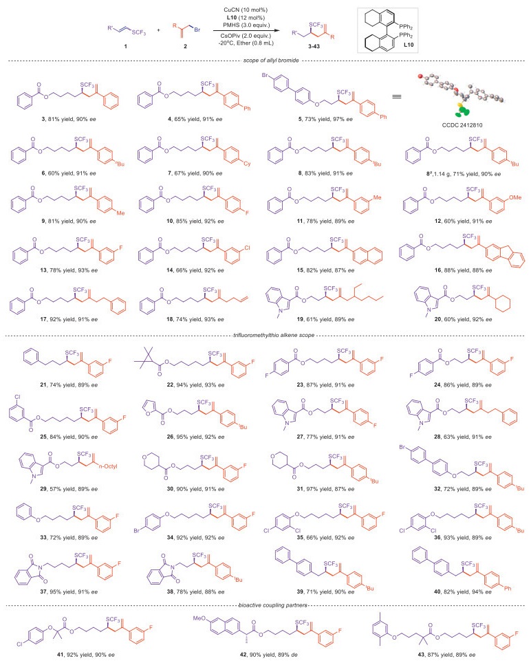 Based on the collective experimental results, we propose a possible reaction mechanism as shown in Scheme 3e. Initially, the in situ formed ligated copper complex LnCu-X (A) undergoes salt metathesis with the base CsOPiv to form the LnCu-OPiv species (B). Next, copper hydride C was furnished by σ-bond metathesis with the hydrosilane. Under the influence of the strong electron-withdrawing nature of the SCF3 group, the double bond of 1-trifluoromethylthioalkene 1 inserts into the Cu–H bond with high regio- and enantioselectivity, yielding the α-SCF3 alkylcopper intermediate D, followed by coupling with allylic bromide 2 via a possible π-allyl or π-en-σ-yl copper intermediate, to give homoallylic trifluoromethylthiolated products and ligated copper.