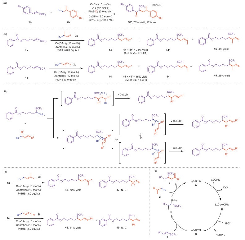 To gain deeper insights into the reaction mechanism of this system, we subsequently carried out a series of mechanistic experiments. Firstly, using Ph2SiD2 for asymmetric catalysis successfully synthesized deuterium-labeled chiral product 39′ (Scheme 3a). The result indicates that the copper hydride species A is formed from hydrosilane, ultimately transferring hydride to 1-SCF3 substituted alkene to form an alkyl copper intermediate. Next, we investigated the hydroallylation step (the transition from D and 2 to A and product in Scheme 3e). Under non-diastereoselective conditions, we tested regioisomeric allylic bromides 3‑bromo‑but-1-ene (2c) and (E)-1-bromobut-2-ene (2d) using the Xantphos ligand (Scheme 3b). The branched allylic bromide 2c reacted with 1a to yield linear products 44 and 44′ in 74% yield, along with 4% of the branched product 45.