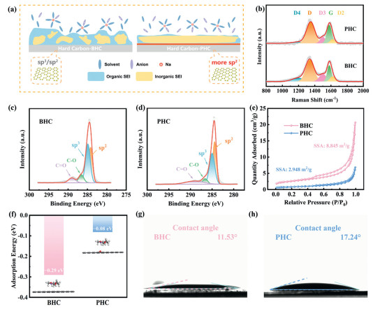 Figure 1.  (a) Diagram of orbital hybridization states formation SEI. (b) Raman spectra of samples. XPS results of (c) BHC and (d) PHC. (e) Nitrogen adsorption-desorption isotherms. (f) Adsorption energy between Na+-G2 group and carbon layer. Contact angle results of electrolyte on (g) BHC and (h) PHC.