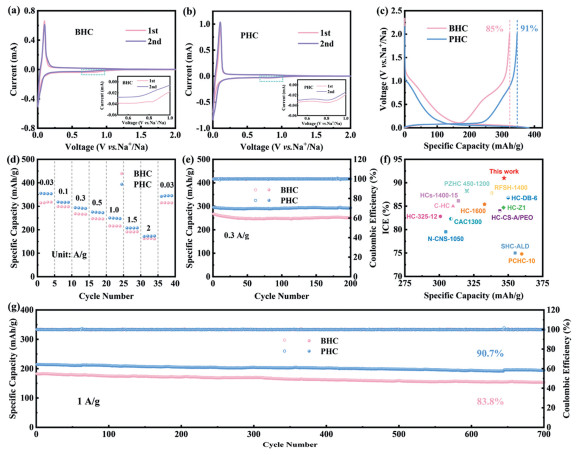 Figure 2.  CV curves of (a) BHC anode and (b) PHC anode. (c) The GCD profiles in first cycle of samples. (d) Rate performance of electrodes. (e) Cycle performance in 0.3 A/g. (f) Performance comparison chart. (g) Cycle performance in 1 A/g.
