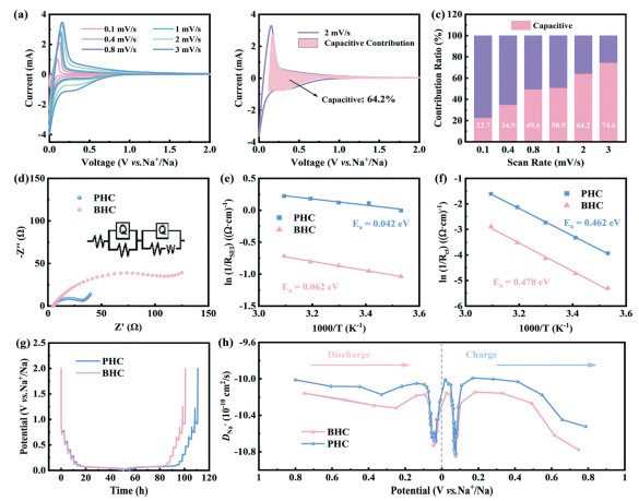 The cyclic voltammetry profiles at various scan rates are presented in Fig. 3a. The CV peaks near 0.1 V exhibit minimal polarization voltage, suggesting favorable electrochemical behavior of Na+. As calculated in Fig. 3b, the capacitive contribution of PHC electrode accounts for 64.2% achieving better rate performance. Quantitative analysis of capacitive contribution at different scan rates (Fig. 3c) reveals a gradual increase in capacitive dominance with elevated scan rates. Concurrently, the PHC electrode demonstrates significantly lower electrochemical impedance compared to BHC (Fig. 3d). As shown in Figs. 3e and f, activation energy calculations derived from temperature-dependent impedance measurements indicate that Na+ transfer through SEI activation energy for PHC (0.042 eV) is lower than that of BHC (0.062 eV), while electrochemical reaction activation energy of PHC (0.462 eV) is also reduced relative to BHC (0.478 eV). Lower activation energy is beneficial to accelerate sodium ions transfer, corresponding to better electrochemical performance. The galvanostatic intermittent titration technique (GITT) voltage-time profiles and corresponding diffusion coefficient profiles are depicted in Figs. 3g and h. The DNa+ demonstrates a gradual decline in diffusion coefficients as the voltage decreases, reaching a minimum near 0.1 V, followed by a slight recovery at lower voltages under 0.1 V. While PHC delivers a analogous diffusion coefficient trend to BHC but higher values. Therefore, PHC electrode delivers a higher Na+ transport rate, revealing a better sodium storage capacity in high current density.