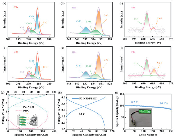Figure 4.  XPS spectra of (a, d) C 1s, (b, e) O 1s, (c, f) F 1s. (g) GCD curves of half-cell about P2-NFM/Na and PHC/Na. (h) Charge and discharge profiles of P2-NFM/PHC full cell at a current density of 0.1 C (1 C = 120 mA/g). (i) Cycle performance of coin full cell at a current density of 0.2 C (1 C = 120 mA/g) based on cathode.