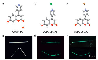 Figure 1.  Chemical structures and mechanical properties. (a, b) CMOH-Py structure and its brittle crystal. (c, d) CMOH-Py-Cl and (e, f) CMOH-Py-Br structures and corresponding elastic crystals under 365 nm UV light irradiation.