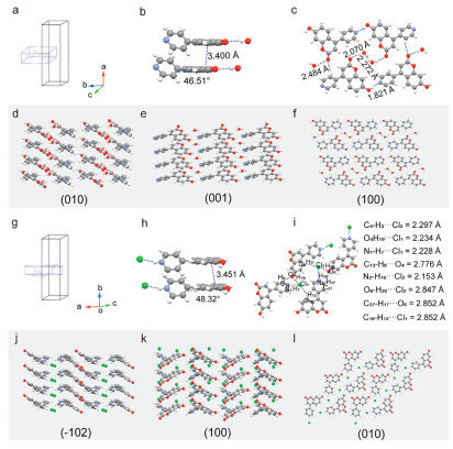 Figure 2  Crystal structures of CMOH-Py and CMOH-Py-Cl. The crystal macroscopic model and molecular packing in CMOH-Py (a-f) and CMOH-Py-Cl (g-l).