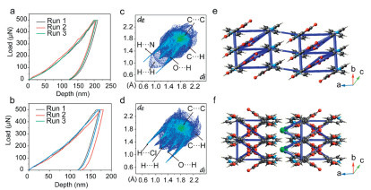 Figure 3.  Mechanical property and intermolecular interaction energy. Load-displacement curves of CMOH-Py (a) and CMOH-Py-Cl (b). The crystal Hirshfeld 2D fingerprint and Energy frameworks corresponding to total energy in CMOH-Py (c, e) and CMOH-Py-Cl (d, f).
