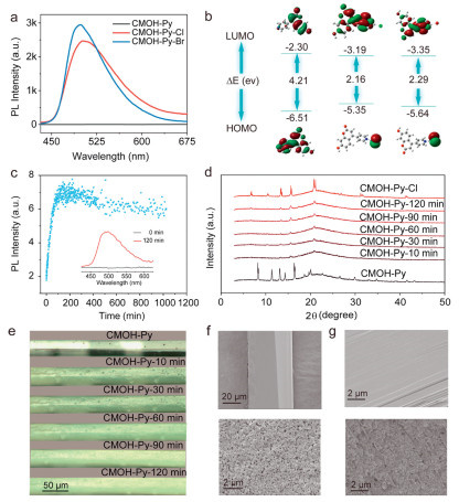 Figure 4  (a) PL spectra of the CMOH-Py, CMOH-Py-Cl and CMOH-Py-Br crystal. (b) Molecular orbital amplitude plots and energy levels of the HOMOs and LUMOs of CMOH-Py, CMOH-Py-Cl and CMOH-Py-Br. (c) The PL intensity, (d) PXRD and (e) optical microscope image of the CMOH-Py crystal varies with time when exposed to HCl vapors. (f) SEM images of the CMOH-Py crystal surface and (g) its cross-section before and after exposure to HCl.