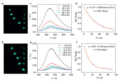 Figure 5  Characterization of the optical waveguiding properties. Images of straight (a) and bent (b) CMOH-Py-Cl crystals excited at 405 nm at various positions. Fluorescence spectra collected from the tips of straight (c) and bent (d) CMOH-Py-Cl crystals with varying distances between the laser excitation point and the crystal tips. Decay of intensity with distance Itip/Ibody of CMOH-Py-Cl in straight (e) and bent (f) states.