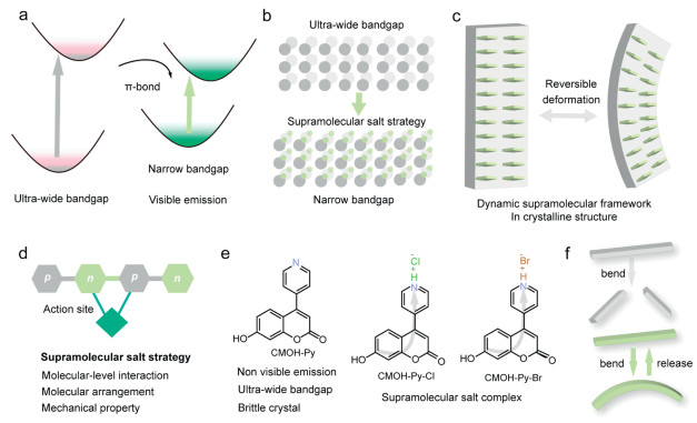 Scheme 1.  Supramolecular salt strategy of molecular crystal for flexible optoelectronics. (a) Energy engineering of conjugated materials via p-n molecular design. (b) Control the energy bandgap via supramolecular salt approach. (c) Reversible deformation of molecular crystal via dynamic supramolecular framework. (d) Supramolecular action site in heteroatomic conjugated molecules to tune their energy bandgap and improve deformation stability for the potential application in flexible optoelectronics. (e) Energy engineering and mechanical elasticity of pyridine-substituted coumarin derivatives (CMOH-Py) crystals via supramolecular salt strategy for flexible visible optical waveguide. (f) Diagram of brittle and weak visible emission CMOH-Py crystal, and green emission and flexible CMOH-Py-Br crystal.