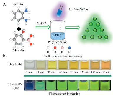• Figure 1  (A) Schematic diagram of B-GQDs synthesis. (B) Color change of the reaction solution under daylight and FL variation at different reaction times.