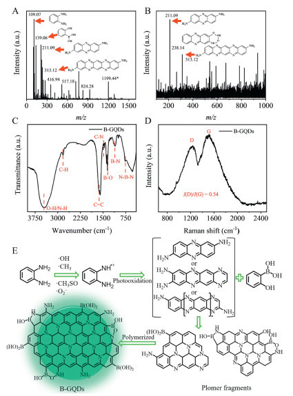 Figure 2  (A) MS of B-GQDs. (B) Secondary MS of ion peak with m/z of 1199.44. (C) FT-IR spectrum of B-GQDs. (D) Raman spectrum of B-GQDs. (E) Path diagram of photocatalytic synthesis of B-GQDs.