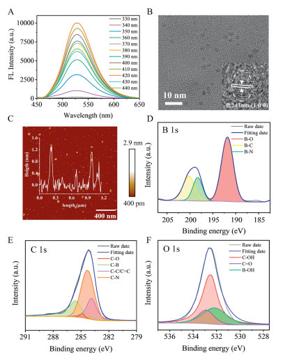 Figure 3  (A) PL emission spectra of B-GQDs under different excitation wavelengths. (B) HRTEM image of B-GQDs (2:1) (The illustration shows the lattice of a single B-GQDs). (C) AFM diagram of B-GQDs (the inset shows the cutting height distribution along the line). (D) B 1s, (E) C 1s and (F) O 1s high-resolution spectra of B-GQDs (2:1).
