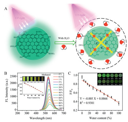 Figure 4  (A) Schematic diagram of water content mechanism by B-GQDs. (B) FL spectra of B-GQDs for different water content in methanol (illustration shows the corrected working curve). (C) Linear curve of FL intensity of paper-based sensor for different water content in methanol.