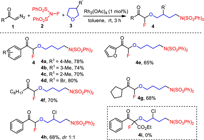 Nitrogen-containing organic compounds such as (aza)uracils, amines and N-heterocyclic molecules are widely used in material science and drug chemistry, which have attracted considerable attention of synthetic chemists owing to their potent biological and pharmaceutical activities [55-58]. In 2016, Szabó and co-workers reported metal-catalyzed ring opening of cyclic ethers with diazo compounds and N-fluorobenzenesulfonimide (Scheme 1) [59]. This reaction is compatible with various aromatic and aliphatic α-diazoketones by using Rh2(OAc)4 as catalyst. Nevertheless, none of the desired product was observed when ethyl phenyldiazoacetate was used as substrate, which might be caused by the lower reactivity of donor−acceptor carbenoids compared to acceptor carbenoids.