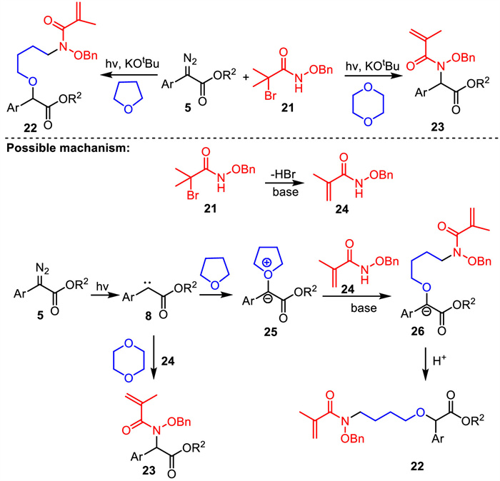 The possible mechanism for this transformation is demonstrated in Scheme 10. Initially, blue light irradiation of α-diazoester generated carbene intermediate 8. Meanwhile, N-(benzyloxy)-2–bromo-2-methylpropanamide 21 was transformed into N-(benzyloxy)methacrylamide 24 through the loss of one molecular HBr in the presence of base. When this reaction was carried out in 1,4-dioxane, the carben intermediate 8 was trapped by 24, affording the N–H insertion product 23. When this reaction was performed in THF, carbene intermediate 8 was trapped by THF to generate the oxonium ylide intermediate 25. Meanwhile, the intermediate 24 underwent a ring-opening reaction with the oxonium ylide intermediate 25 yielding an anion intermediate 26 in the presence of base. Finally, the protonation of anion intermediate 26 generated the final N—H functionalization product 22.