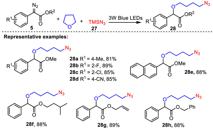 In 2022, Wei’s group described a novel visible-light-initiated three-component carbene transfer reaction for the synthesis of organic azides [65]. The method involves the reaction of α-diazoester, tetrahydrofuran, and TMSN3 to efficiently obtain diverse azidation products in the absence of any bases, strong oxidants, external metal reagents and photocatalysts. The representative examples for this transformation are described in Scheme 11. Aryl diazoesters with functional groups at the phenyl ring provided the corresponding products 28a-28d in 81%−89% yields. Methyl 1-naphthyldiazoacetate was also tolerated well in this process, affording the desired product 28e in 88% yield. In addition, α-diazoesters with a range of substituents at the ester position including isopentyl, allyl and benzyl groups were all suitable for the reaction to form the expected products 28f-28h in good yields.