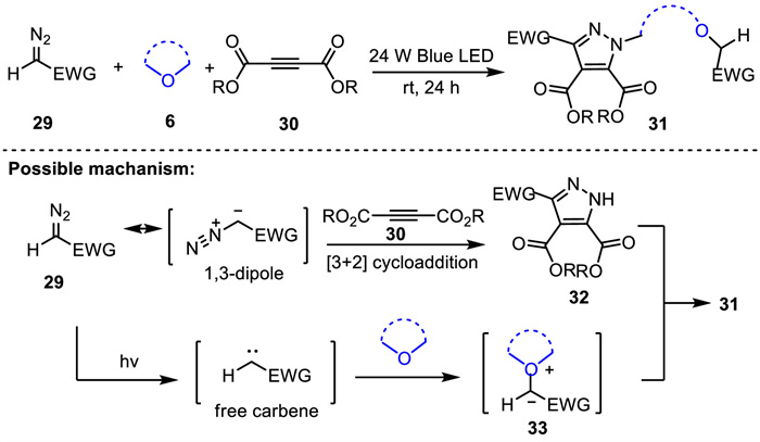 In 2023, Xuan’s group reported visible-light-promoted multi-component reaction of diazoalkanes, alkynes, and cyclic ethers to synthesize poly-substituted pyrazoles (Scheme 12) [66]. This reaction could be conducted under mild conditions using both cycloaddition reactivity and the carbene reactivity of diazoalkanes in one pot procedure. The detailed reaction pathway is presented in Scheme 12. Initially, the [3 + 2]-cycloaddition of diazoalkane 29 and alkyne 30 afforded the 1H-pyrazole-3,4,5-tricarboxylate intermediate 32. Meanwhile, the photolysis of diazoalkane generated a free carbene, which will be trapped by cyclic ether to give oxonium ylide intermediate 33. Then, the nucleophilic ring opening of oxonium ylide 33 with 32 produced the multi-substituted pyrazole 31.