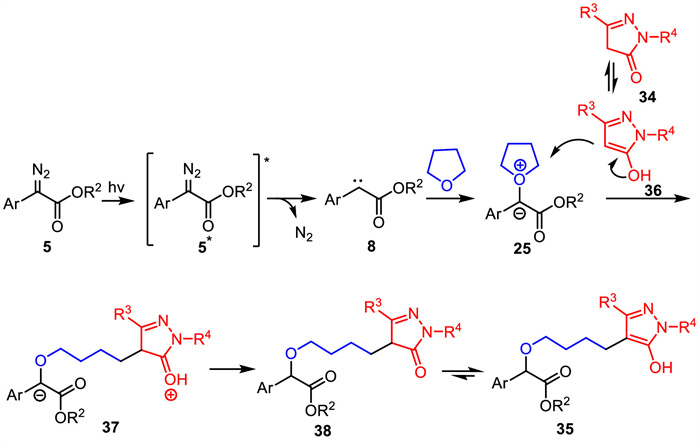 The possible reaction pathway for this method is described in Scheme 14. First, α-diazoester generated its excited state 5* under the irradiation of 3 W blue LEDs. Excited state 5* would give the free carbene intermediate 8 with the loss of N2. Subsequently, the reaction of carbene intermediate 8 with THF produced oxonium ylide intermediate 25 Meanwhile, enol intermediate 34 was formed through the tautomerization of pyrazolone 36. Then, the ring-opening of oxonium ylide 25 with enol intermediate 36 gave intermediate 37, which underwent intramolecular hydrogen transfer to give substituted pyrazolone 38. Finally, the desired pyrazole 35 was produced through rapid tautomerization.