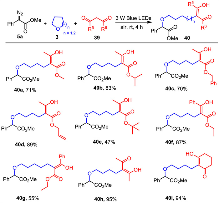 Notably, when 1,3-dicarbonyl compound 39 was employed in this reaction system, a number of substituted 1,3-dicarbonyl derivatives 40 could also be efficiently obtained through visible-light-mediated carbene transfer reaction of α-diazoesters with cyclic ethers and 1,3-dicarbonyl compounds (Scheme 15).