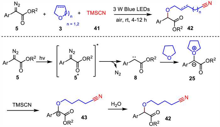 In the same year, Wei and co-workers also reported an additive-free visible-light-mediated three-component reaction of α-diazoesters with cyclic ethers and TMSCN to access structurally diverse organic nitriles (Scheme 16) [65]. This reaction was conducted at room temperature to afford organic nitriles by using TMSCN as nucleophile. It is worth noting that the resulting nitrile products could be converted to other useful compounds such as amide and phosphoramidate. A plausible reaction pathway is proposed in Scheme 16. Initially, carbene intermediate 8 was generated from α-diazoester under visible-light irradiation. Subsequently, the carbene intermediate 8 was trapped by ether to form the oxonium ylide intermediate 25. Then, the nucleophilic addition of TMSCN 41 to oxonium ylide intermediate 25 gave intermediate 43. Finally, the protonation of intermediate 43 by water produced the corresponding product 42.
