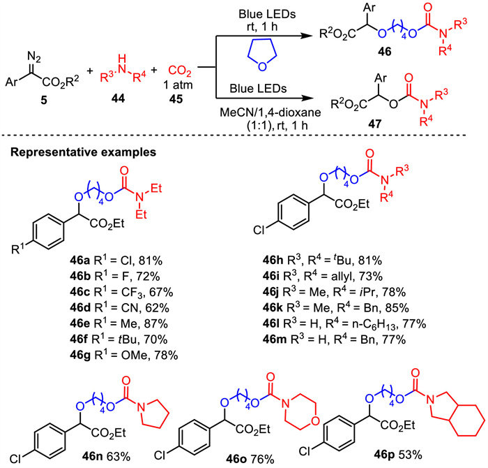 Carbon dioxide (CO2) is widely utilized as a C1 feedstock in organic synthesis due to its abundance, nontoxicity, and renewability [71,72]. In 2020, Jiang’s group reported a visible-light-promoted strategy for the synthesis of organic carbamates from carbon dioxide under catalyst- and additive-free conditions [73]. When THF was used as the solvent in system, a number of organic carbamates were obtained through visible-light-induced four-component carbene transfer reaction of α-aryldiazoesters with amines, carbon dioxide and THF. However, when 1,4-dioxane/MeCN (1:1) mixed solvent was used as the reaction medium, three-component coupling reaction of α-aryldiazoesters, amines and carbon dioxide proceeded smoothly to construct various three-component organic carbamates (Scheme 17).