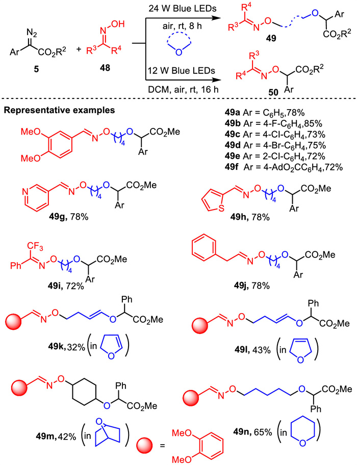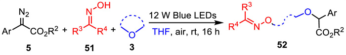 Oxime ethers are important organic compounds with applications in medicinal and synthetic organic chemistry [74,75]. In 2021, Xuan and co-workers described a green and sustainable method for the formation of oxime ethers via visible-light-promoted O-H functionalization of oximes with aryldiazoesters [76]. When cyclic ether was used as the solvent, visible-light-promoted cyclic ethers-participated three-component ring-opening reaction underwent efficiently under mild conditions. The reaction demonstrates a broad substrate scope and representative examples are demonstrated in Scheme 18. α-Aryldiazoesters with different electron-neutral, electron-donating, or electron-withdrawing substituents on the phenyl ring were well-tolerated to provide the desired products in good yields with broad functional group tolerance. Different aryl-substituted aldoximes and acetophenone-derived oximes reacted well under the standard reaction conditions to give the corresponding oxime ethers in moderate to good yields. Heteroaryl-substituted aldoximes and acetophenone-derived oximes all reacted well to provide the corresponding oxime ethers in moderate to good yields. In addition to tetrahydrofuran, other cyclic ethers such as 2,3-dihydrofuran, 2,3-dihydrofuran, tetrahydropyran, and 1,4-dioxane are also successfully applied in this procedure, and the corresponding products are obtained in moderate yields.