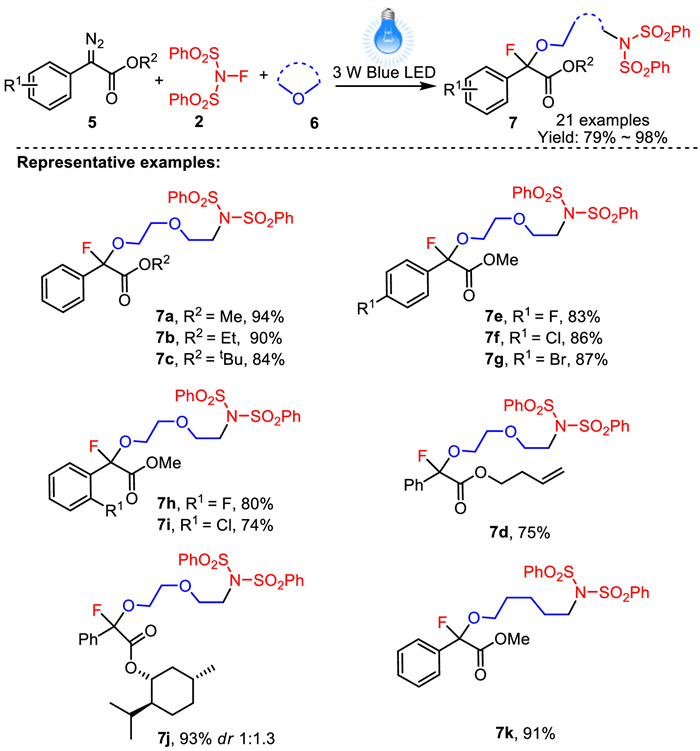 In 2020, Koenigs and co-workers developed visible-light-mediated method for the construction of fluoroamino etherification products from aryldiazoacetates, NFSI and cyclic ethers under the irradiation of 3 W blue LEDs [60]. The reaction exhibited a broad substrate scope and aryldiazoacetates with different substitution patterns at the ester group and the aromatic ring were compatible with this reaction, affording the corresponding products in moderate to good yields (Scheme 2).