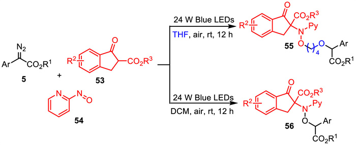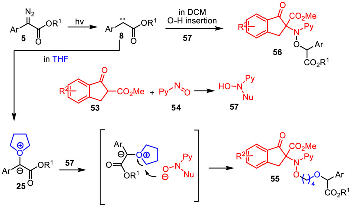 The possible reaction pathway for this reaction is described in Scheme 21. First, β-keto ester 53 reacted with 2-nitrosopyridine 54 to generate product 57. Meanwhile, visible-light irradiation of aryldiazoacetate produced the reactive carbene species 8 with the loss of N2. When the reaction was performed in DCM, carbene 8 underwent O–H insertion with 57 to obtain the corresponding three-component product 56. Moreover, when the reaction was performed in THF, the carbene 8 was trapped by THF to form the active oxonium ylide intermediate 25. Finally, nucleophilic ring-opening of oxonium ylide intermediate 25 by 57 yielded the corresponding four-component product 55.