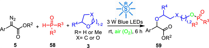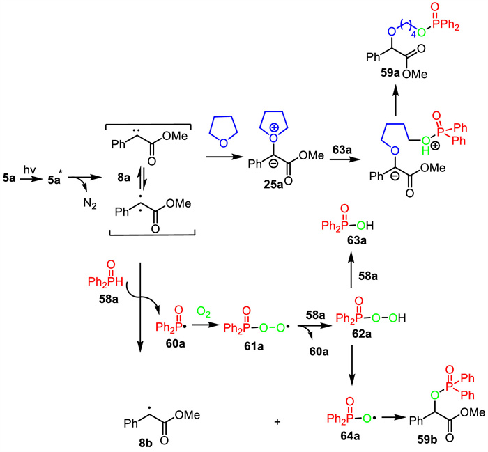 The possible mechanism for this transformation is demonstrated in Scheme 23. First, methyl phenyldiazoacetate 5a formed an excited state 5a* under visible-light irradiation, which underwent denitrogenation to generate free carbene intermediate 8a. Then, free carbene intermediate 8a was smoothly attacked by THF to form oxonium ylide intermediate 25a. Meanwhile, free carbene intermediate 8a abstracts the hydrogen atom from diphenylphosphine oxide 58a would give phosphinoyl radical 60a and carbon radical 8b. Next, the reaction of phosphinoyl radical 60a with dioxygen provided a peroxy radical intermediate 61a, which abstracted a hydrogen atom from 58a to offer phosphinoyl radical 60a and phosphoryl hydroperoxide 62a. The reduction of phosphoryl hydroperoxide 62a by diphenylphosphine oxide 58a generated diphenylphosphinic acid 63a. Then, the nucleophilic reaction of diphenylphosphinic acid 63a with oxonium ylide intermediate 25a and intramolecular hydrogen transfer afforded the desired product 59a. On the other hand, the coupling of carbon radical 8b and phosphoryloxy radical 64a could also give the product 59b.