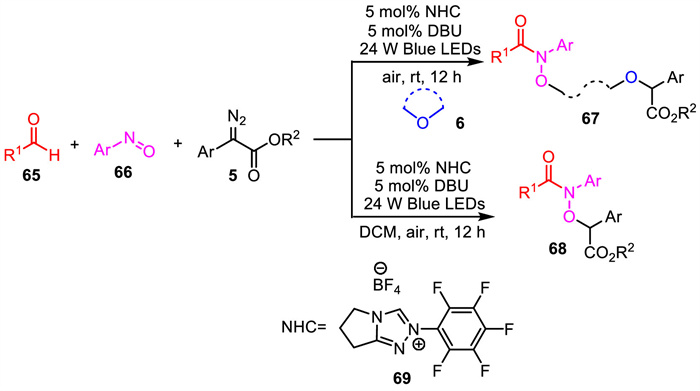 Hydroxamic acid esters are important pharmacological compounds with a broad spectrum of activities, including antibacterial, antifungal, and anticancer properties [80,81]. In 2022, Xuan and Koenigs provided a mild approach for the synthesis of hydroxamic acid esters through visible-light-promoted NHC-catalyzed photochemical multi-component carbene transfer reactions (Scheme 24) [82]. When cyclic ether was used as the solvent in this system, the four-component reaction of aldehydes, nitrosoarenes, α-diazoalkanes and cyclic ether underwent efficiently to deliver various biologically important hydroxamic acid esters 67 in moderate to good yields. On the other hand, when DCM was used as reaction medium, the reaction of aldehydes, nitrosoarenes and α-diazoalkanes generated the expected three-component products 68 under the irradiation of 24 W blue LED. NHC-catalyzed formation of hydroxamic acid and blue light-mediated generation of free carbene species are two key factors for both multi-component carbene transfer reactions.