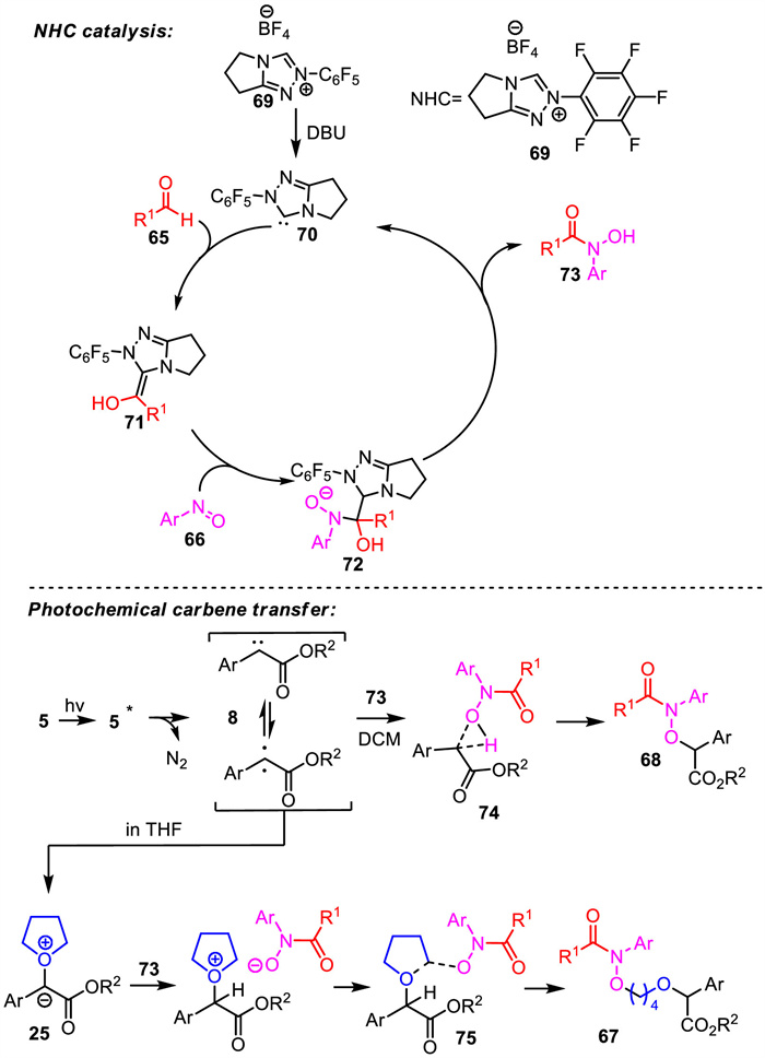 Xuan and Koenigs propose the detailed mechanism as presented in Scheme 25. Under the standard reaction conditions, the deprotonation of triazolium salt 69 generated the NHC catalyst 70, which activated aldehyde to afford the nucleophilic Breslow intermediate 71. Next, nucleophilic addition of the nucleophilic Breslow intermediate 71 to nitroarenes afforded intermediate 72. Then, hydroxamic acid 73 was produced through the release of NHC catalyst 70. Meanwhile, aryldiazoacetate 5 underwent denitrogenation to generate free carbene intermediate 8 under blue LED. When the reaction was performed in THF, this reaction would generate an oxonium ylide intermediate 25, which reacted with 73 to produce the four-component product 67. When the reaction was performed in DCM, free carbene intermediate 8 reacted with 73 to obtain the three-component product 68 through O–H insertion.