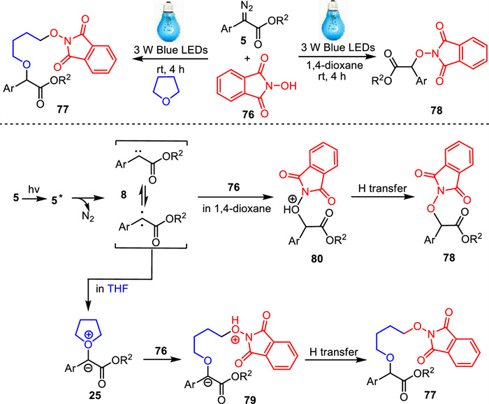 In 2022, Wei's group reported a visible-light-induced method for constructing α-oxyimido esters through the denitrification oxygenation reaction of α-diazo esters with N-hydroxyphthalimide (NHI) [83]. A number of α-oximide esters were synthesized effectively in 1,4-dioxane at room temperature under irradiation of 3 W blue LED lamps in the absence of photocatalyst. When THF was used as the solvent, three-component coupling products involving ring-opening of tetrahydrofuran could be conveniently obtained. The reaction could also be scaled up to gram scale, which provided a green and practical synthetic method to access α-oxyimide esters. The possible reaction pathway involves the denitrogenation process of α-diazoester under 3 W blue LED irradiation, formation of oxonium ylide intermediate and subsequent nucleophilic ring-opening of oxonium ylide with NHI (Scheme 26).